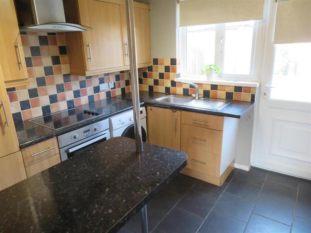 Fitted kitchen with range of high and low level fitted units and breakfast bar, built in oven and hob with extractor above, integrated fridge freezer, plumbed space for washing machine, built in larder cupboard, tiled floor, partially tiled walls and PVC back door to rear.