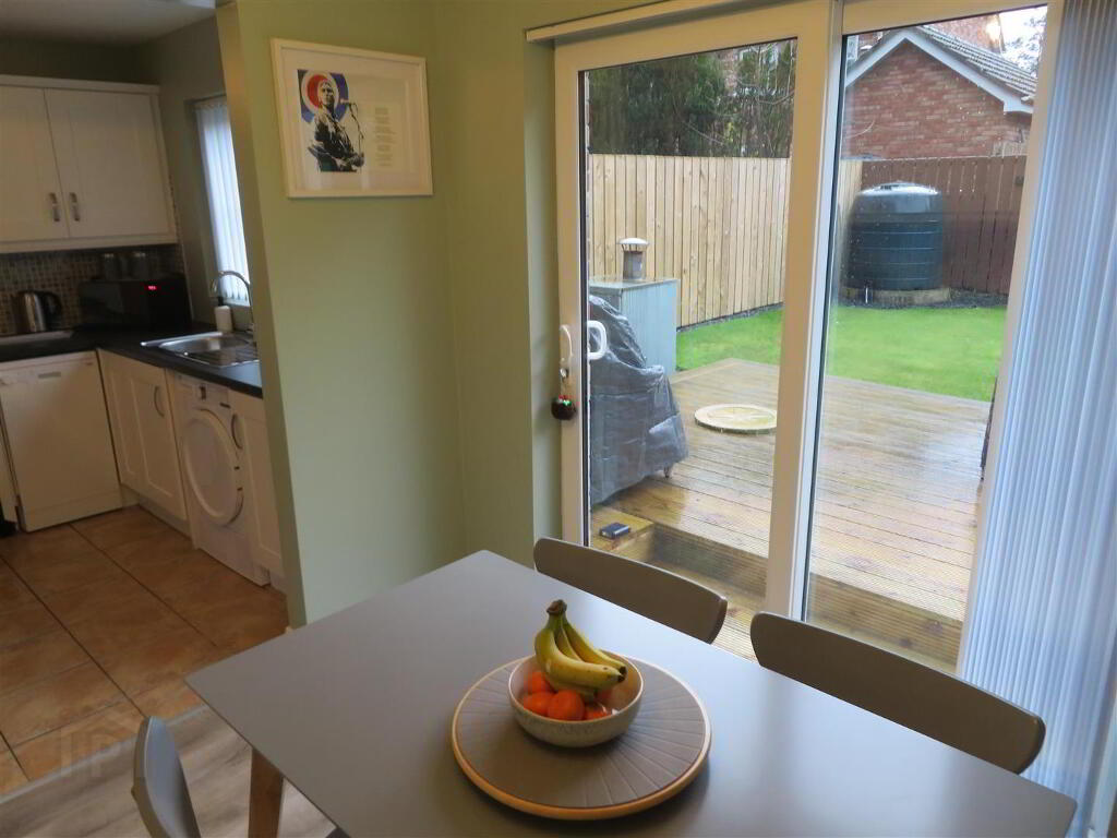 Open plan kitchen diner with great range of high and low level fitted units, space for free standing cooker with stainless steel extractor hood above, plumbed space for washing machine, space for free standing fridge freezer, tiled floor in kitchen, laminate in dining room, partially tiled walls and sliding patio door to rear.