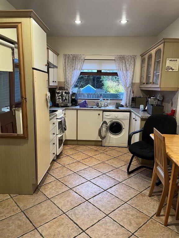 Traditional kitchen with good range of high and low level fitted units, space for free standing cooker with extractor hood above, plumbed space for washing machine, tiled flooring, partially tiled walls, recessed lights and timber back door to rear.