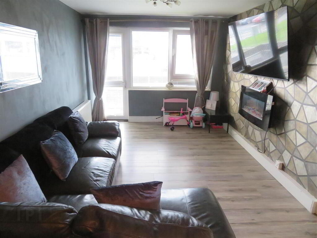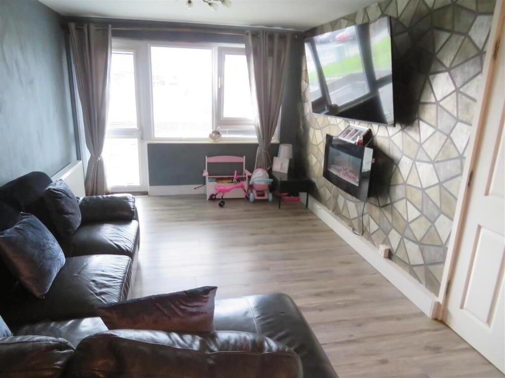 Super reception room encompassing dining area and open plan through to kitchen. Wood laminate flooring, PVC balcony door with front aspect and wall mounted electric fire.