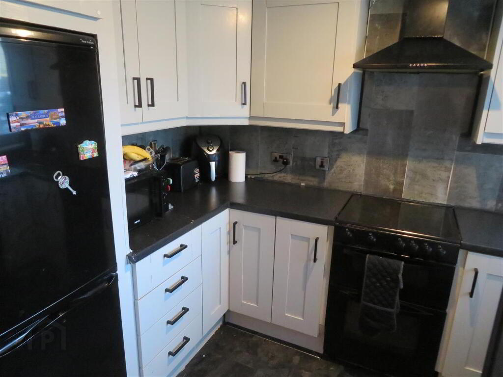 Modern kitchen with good range of high and low level units, space for cooker and fridge, plumbed space for dishwasher, vinyl flooring and partial PVC paneling on walls.