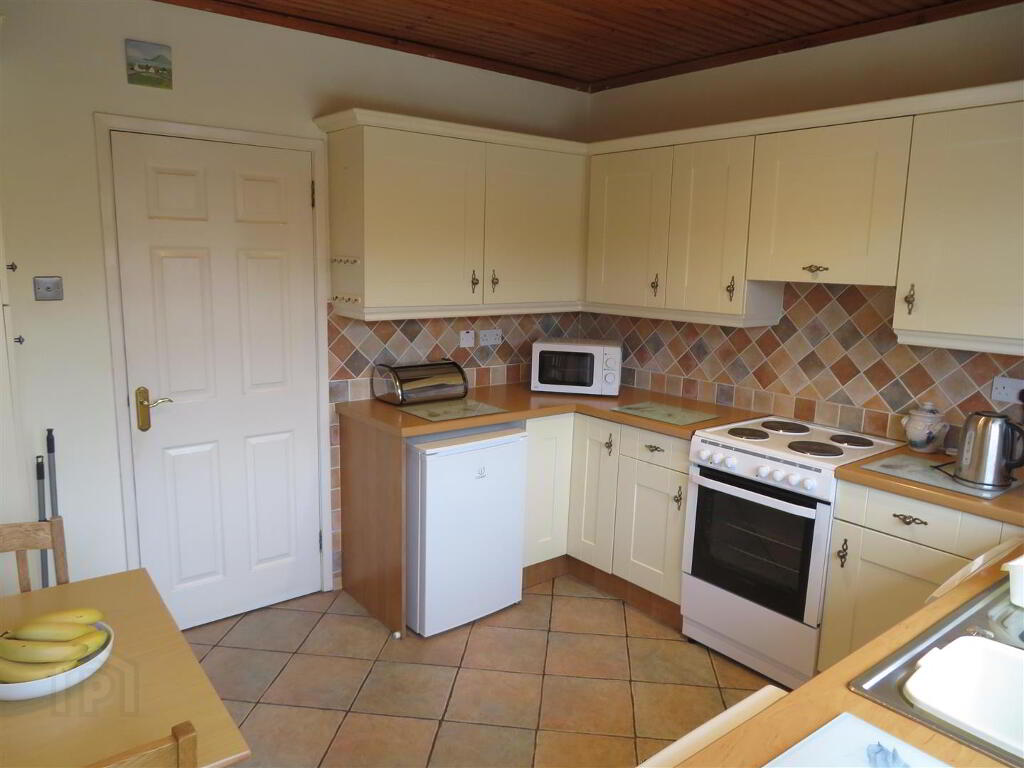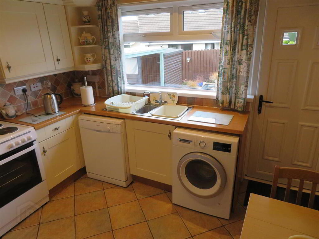 Good range of high and low level fitted units, space for free standing cooker, plumbed spaces for washing machine and dishwasher, space for under counter fridge, 1.5 bowl stainless steel sink unit with drainer and mixer tap, tiled floor, partially tiled walls and PVC back door to rear.