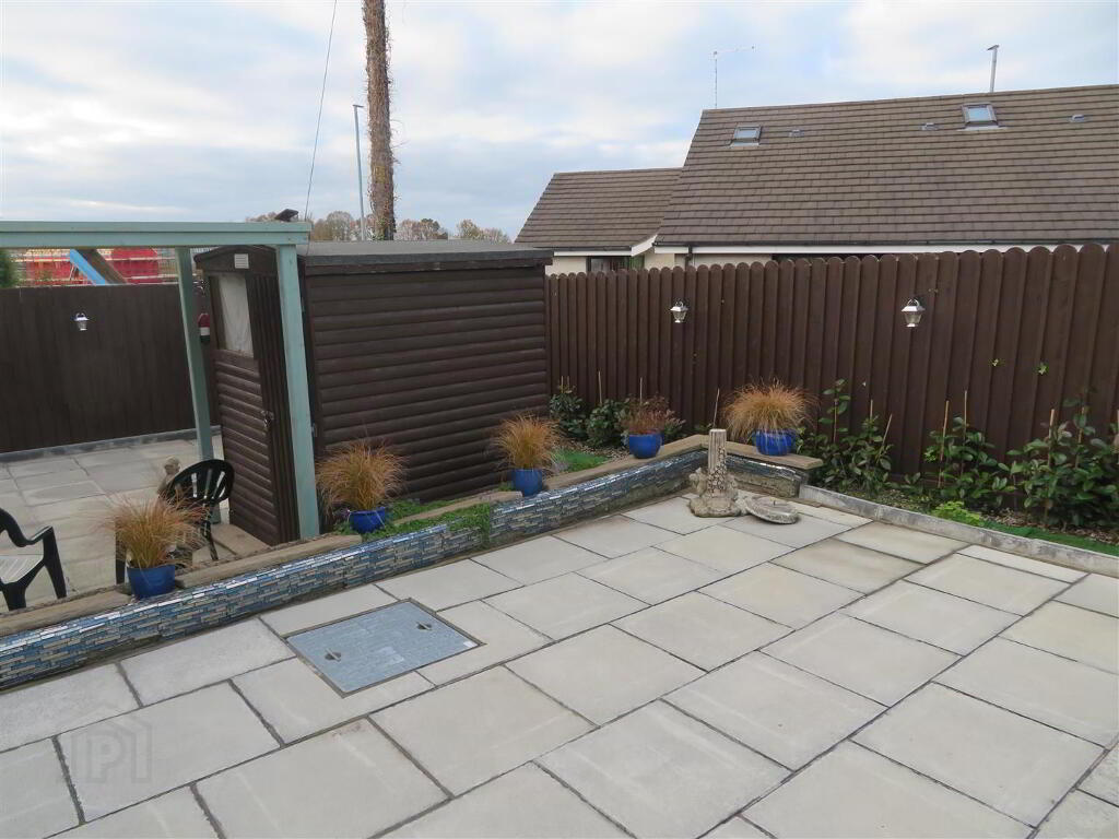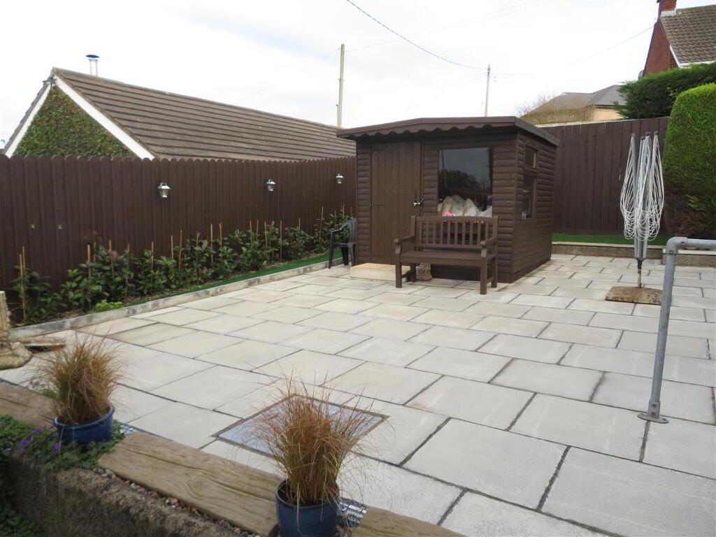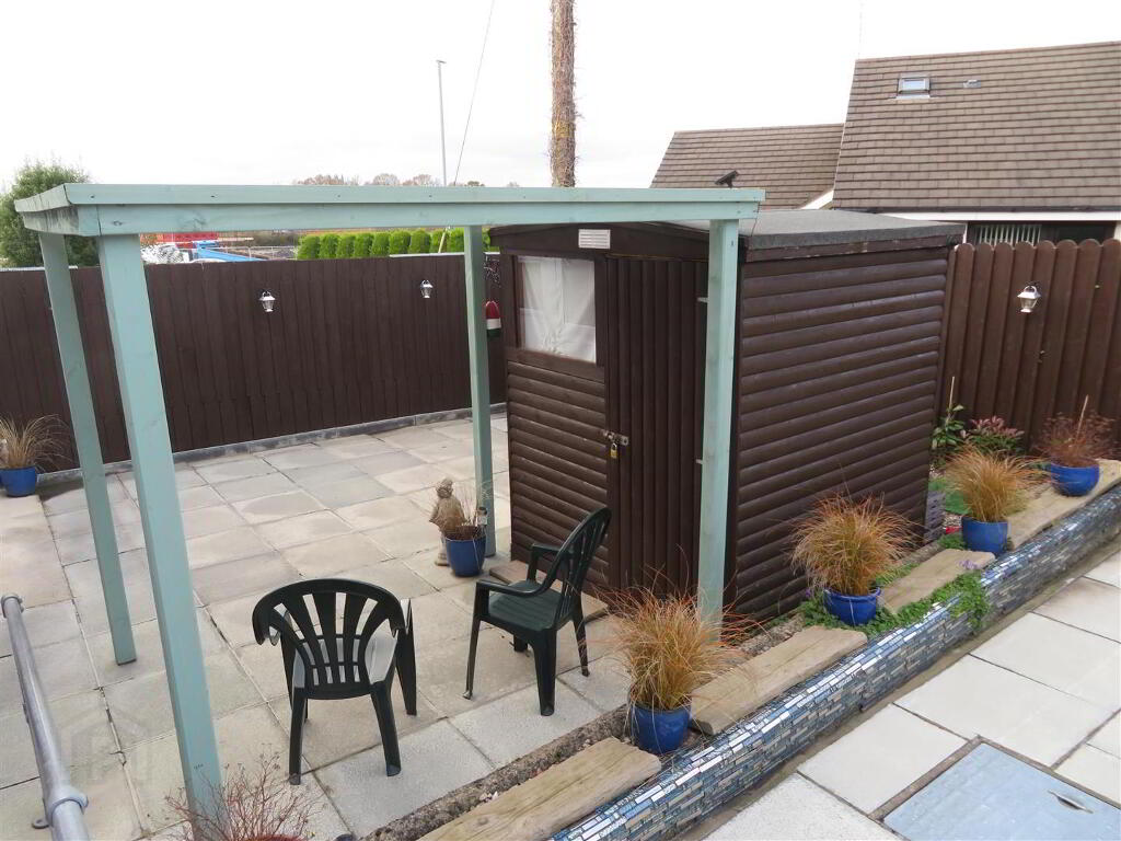 Concrete driveway to side of house, planted shrub beds to front. Fully enclosed rear comprising split level patios, pergola and sheds.