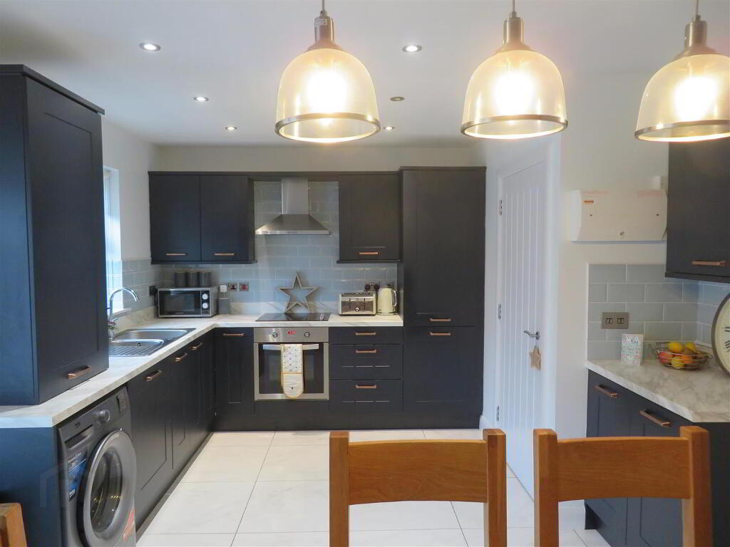 Modern kitchen with good range of high and low fitted units with contrasting rose gold handles, integrated fridge freezer and dishwasher, built in oven and hob with stainless steel extractor above, plumbed space for washing machine, 1.5 bowl stainless steel sink unit, tiled floor, partially tiled walls, recessed lights and double patio doors to rear.