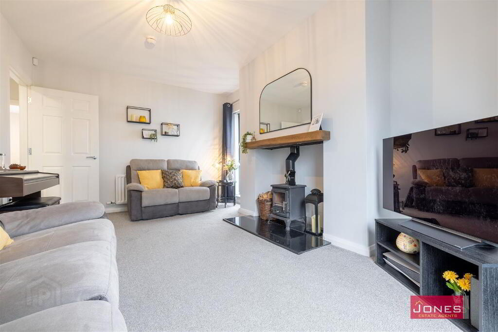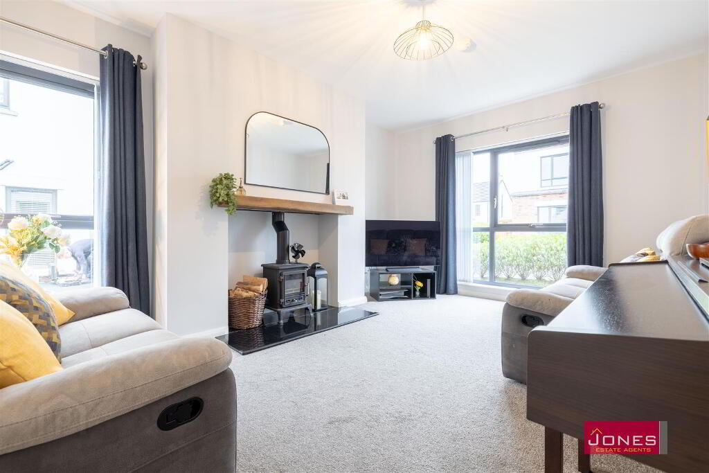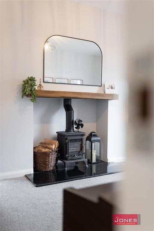 Bright reception room benefitting from floor to ceiling windows with attractive wood burning stove set on granite hearth and carpet flooring.