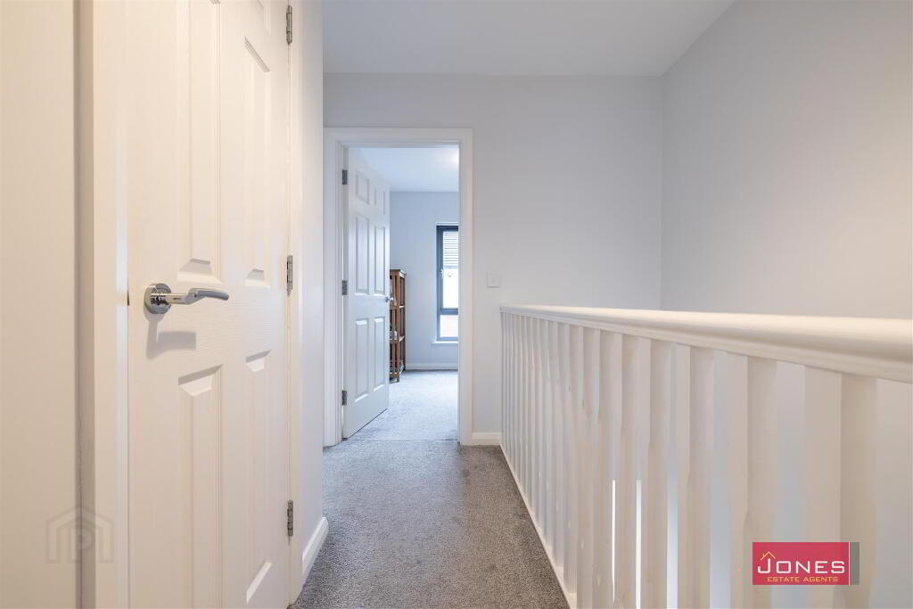 Carpet flooring on stairs and landing, built in storage and attic access.
