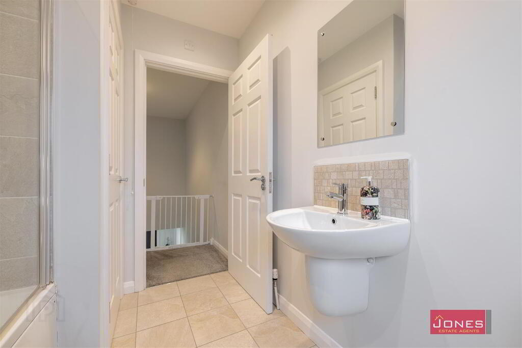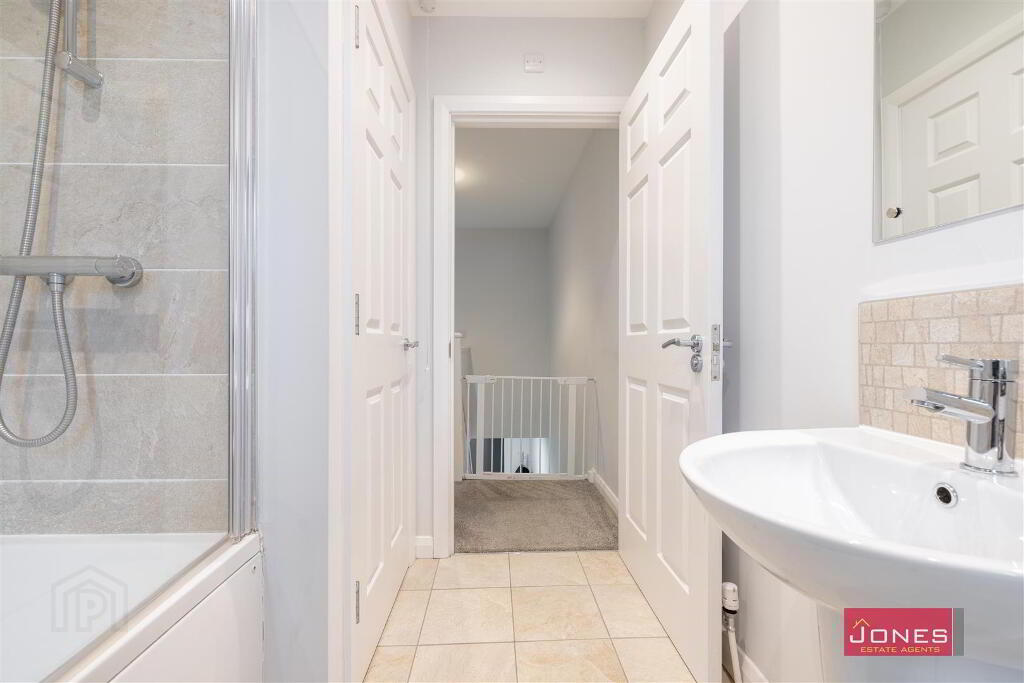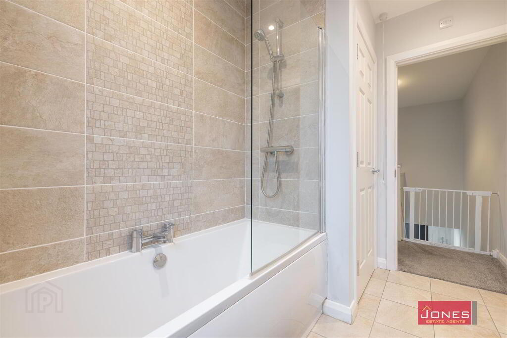 White bathroom suite comprising panel bath with shower above, dual flush WC and wash hand basin, partially tiled walls, tiled floor and built in storage.