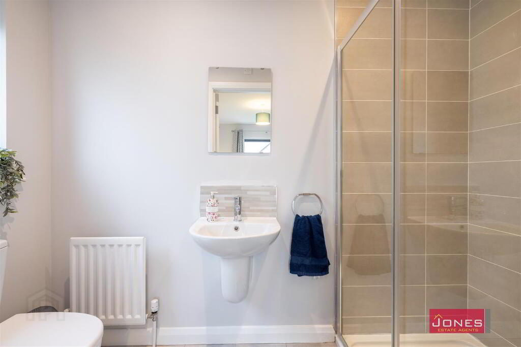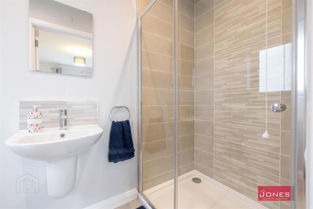 Mains powered shower, dual flush WC and wash hand basin, tiled floor, partially tied walls.