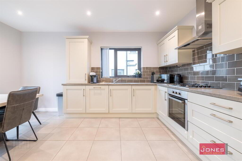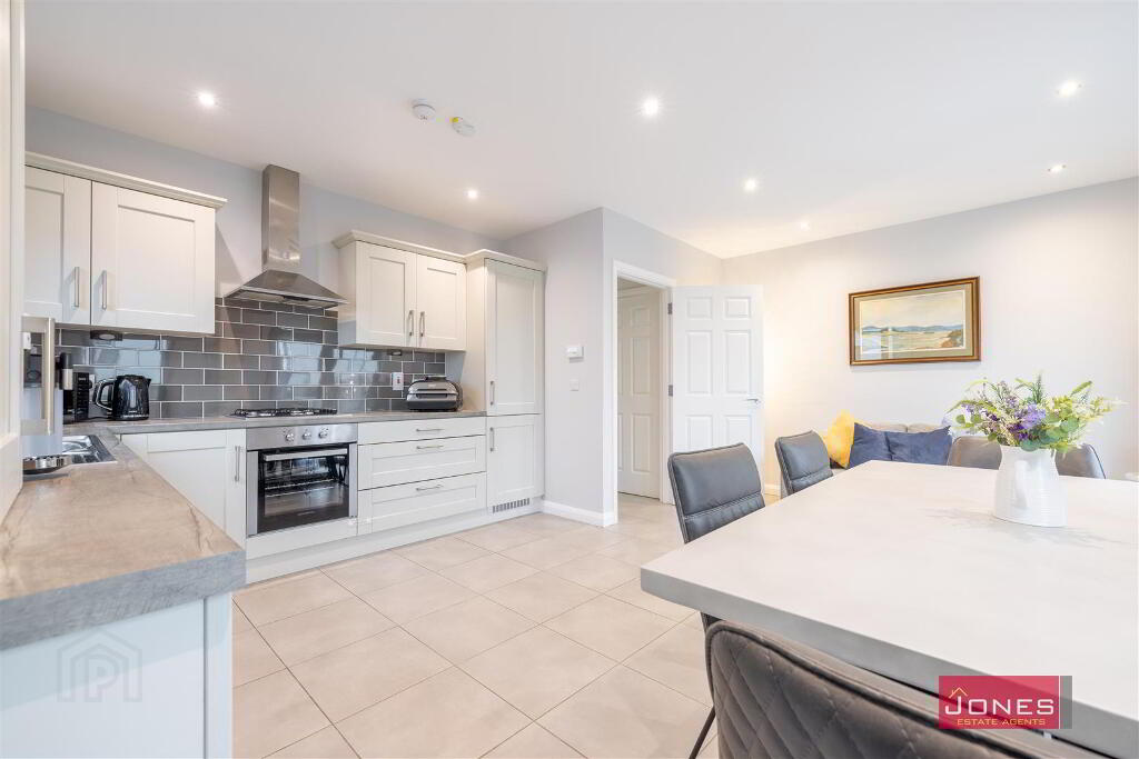 Spacious kitchen diner, good range of high and low fitted units, built in oven and gas hob with stainless steel extractor hood above, integrated fridge freezer, dishwasher and washing machine, tiled flooring, partially tiled walls, recessed lights and double patio doors to rear.