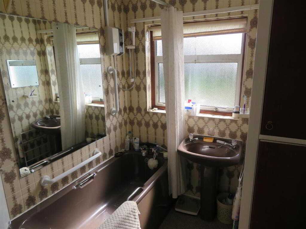 Panel bath with electric shower above, WC and pedestal wash hand basin. Built in hot press/ fully tiled walls and carpet flooring.