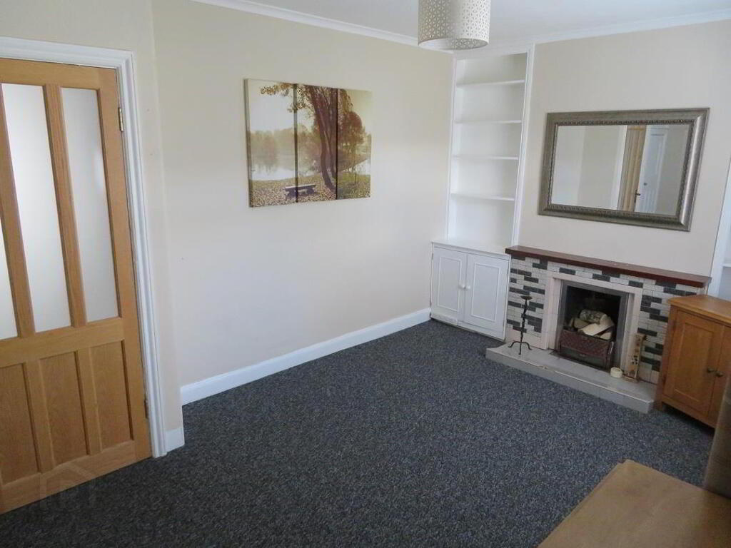 Rear aspect reception room with traditional tiled fireplace housing open fire, built in storage under stair and carpet flooring.