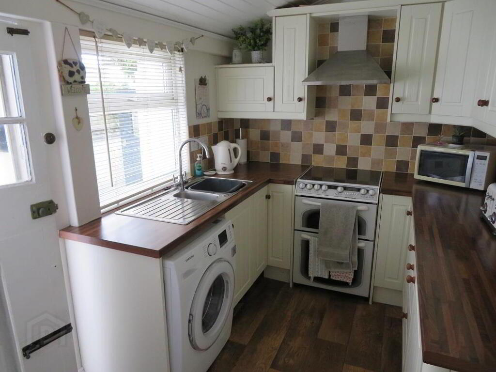 Galley style kitchen with range of high and low level fitted units, space for free standing cooker, plumbed space for washing machine, vinyl flooring, partially tiled walls and timber back door to rear.
