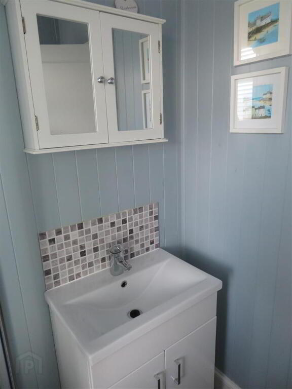Corner cabinet with mains powered shower and PVC panelling, wash hand basin with vanity, WC and vinyl flooring.