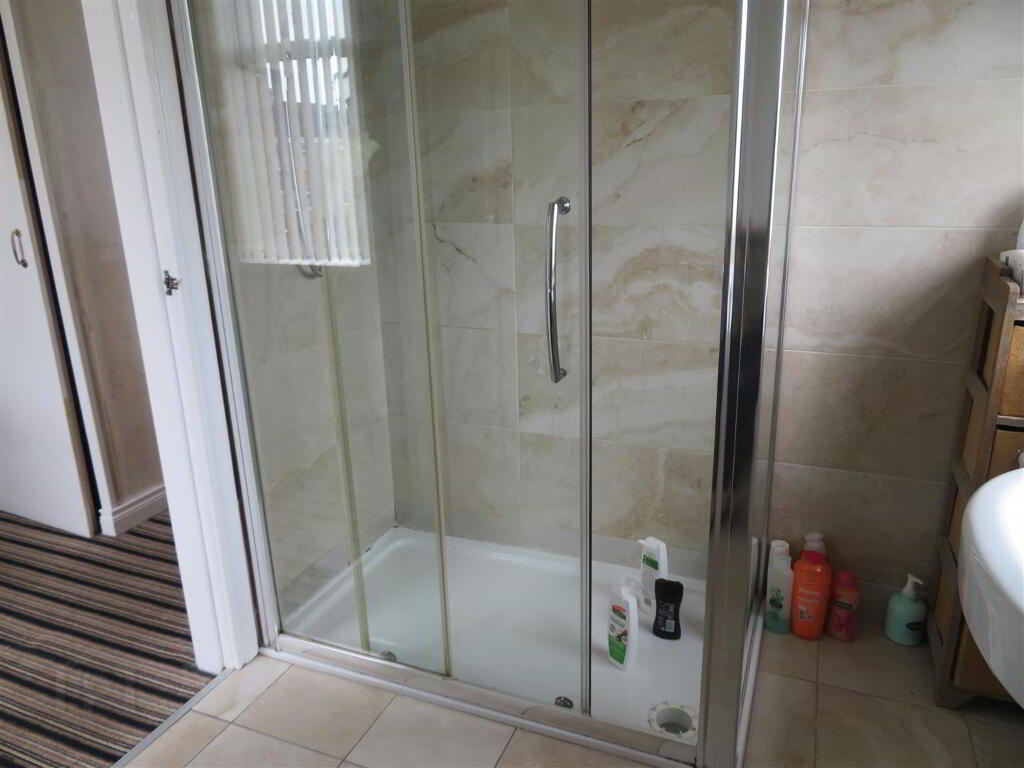 White bathroom suite comprising pedestal wash hand basin, WC and large walk in cabinet with electric shower, fully tiled walls and floor.