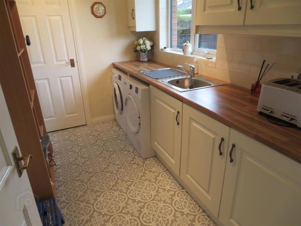 Accessed via rear hall. Plumbed space for washing machine and space for tumble dryer, high and low fitted units, stainless steel sink unit, vinyl flooring, partially tiled walls and built in storage.