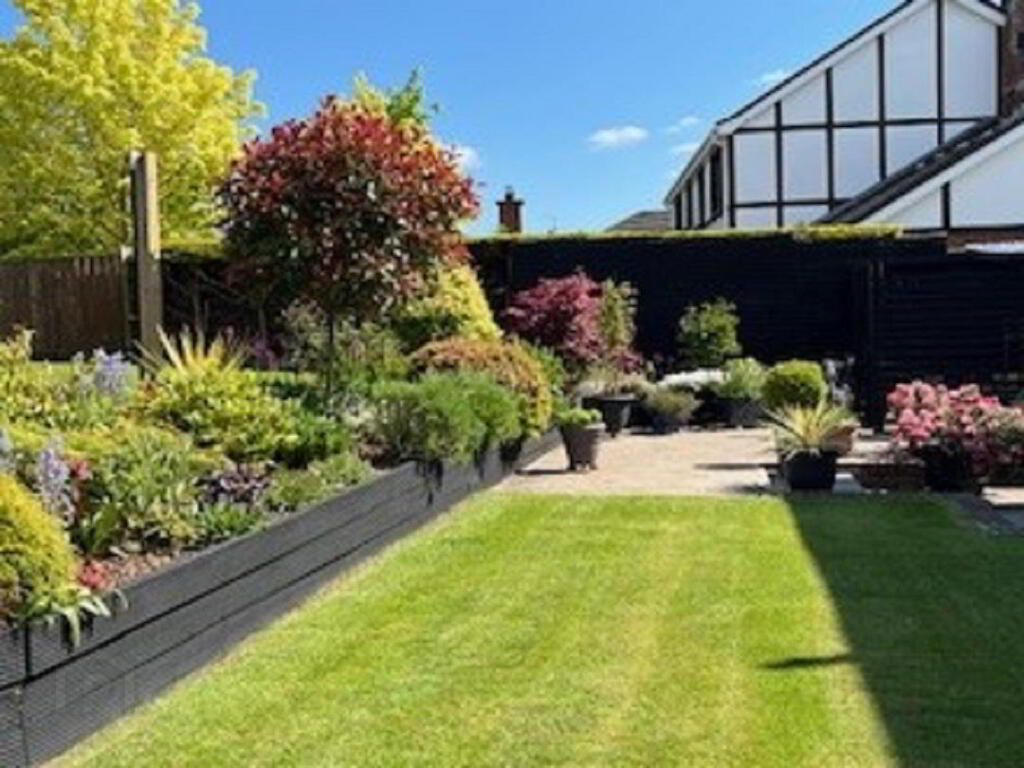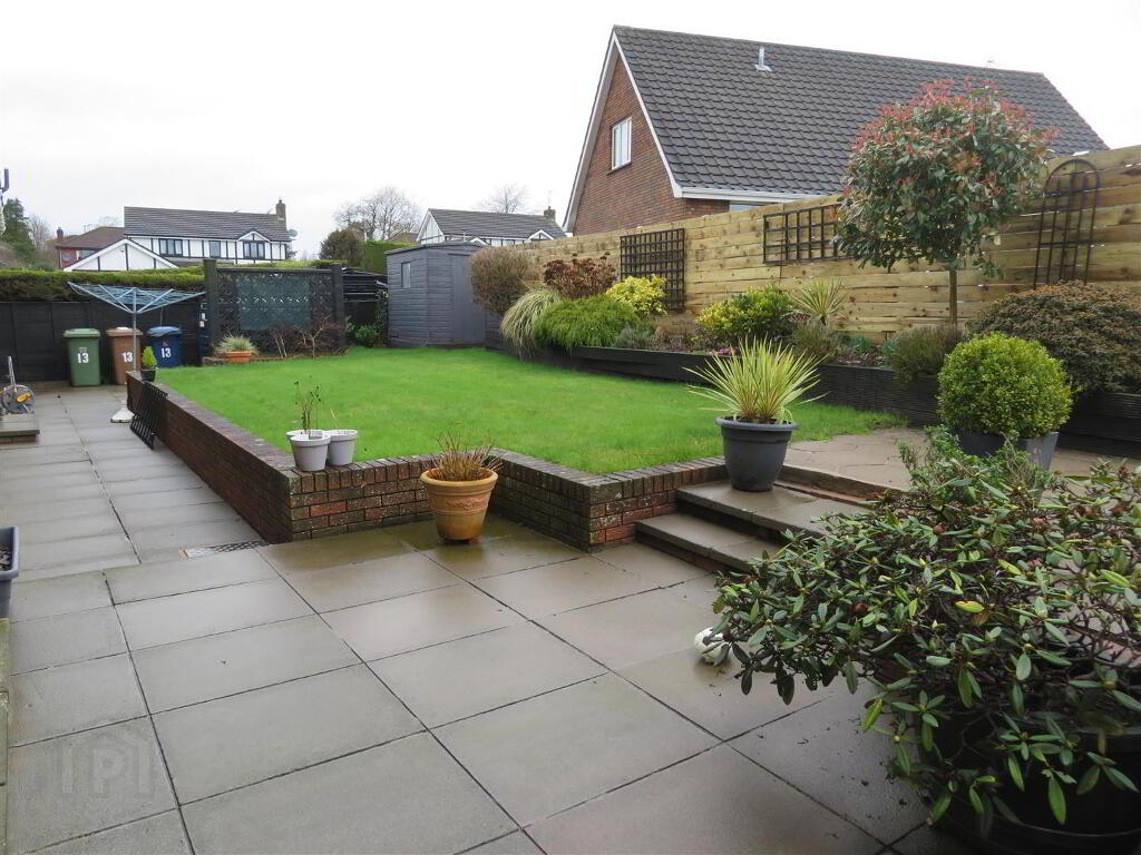 Large tarmac driveway with ample space for several cars. Front garden laid in lawn with mature planted shrub beds. Fully enclosed rear comprising lawn, raised patio and raised shrub beds.