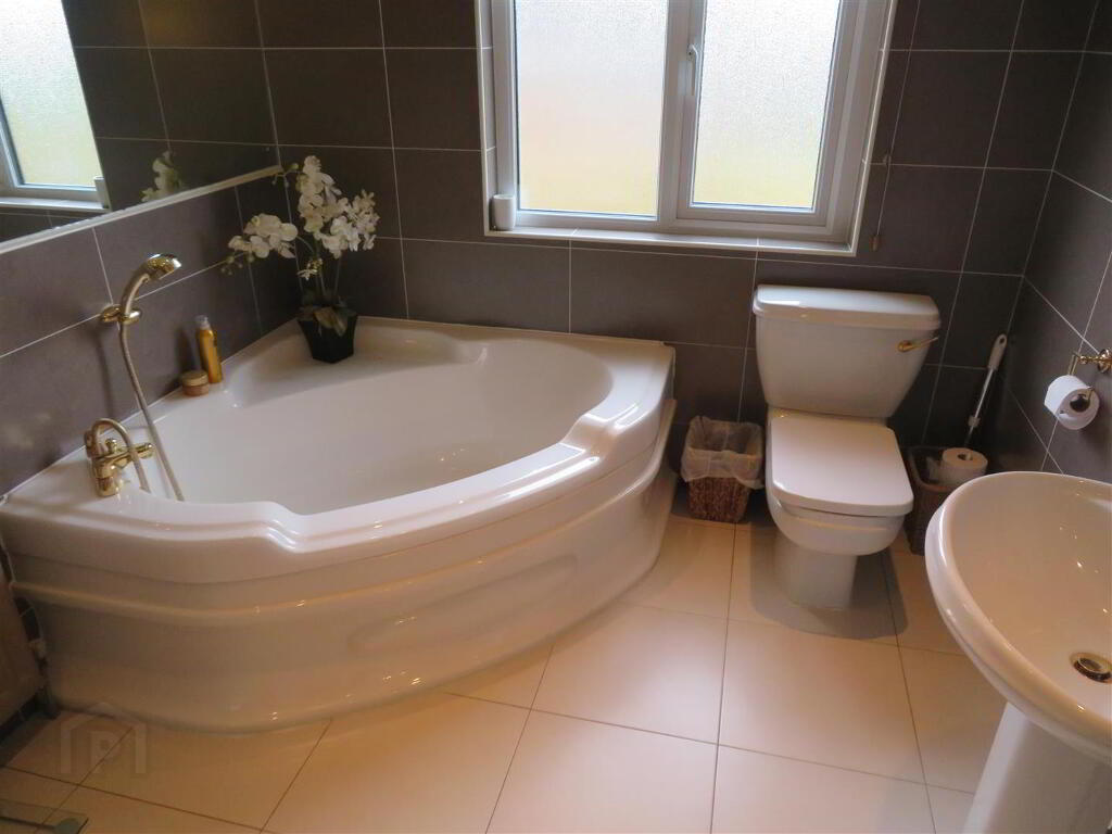 Spacious bathroom comprising large corner panel bath, pedestal wash hand basin, mains powered shower in corner cabinet and WC. Fully tiled walls and floor, recessed lights.