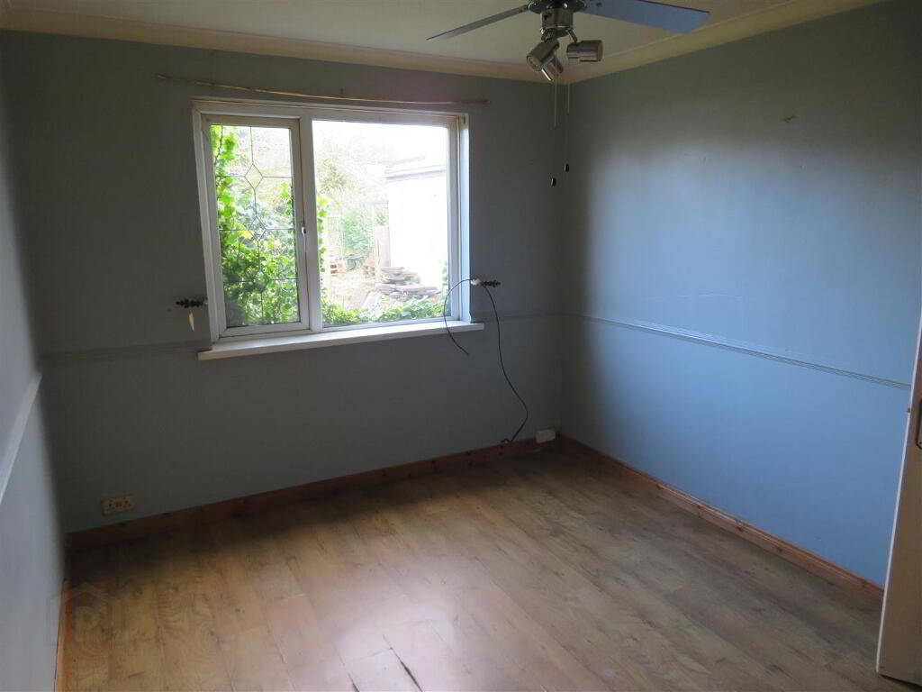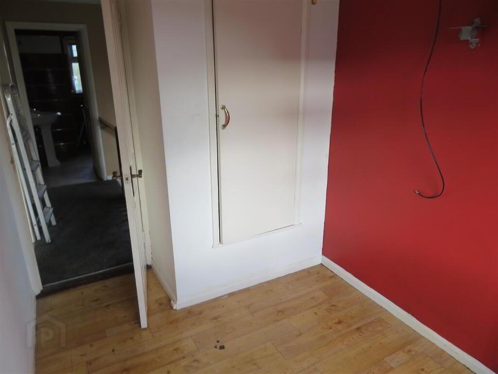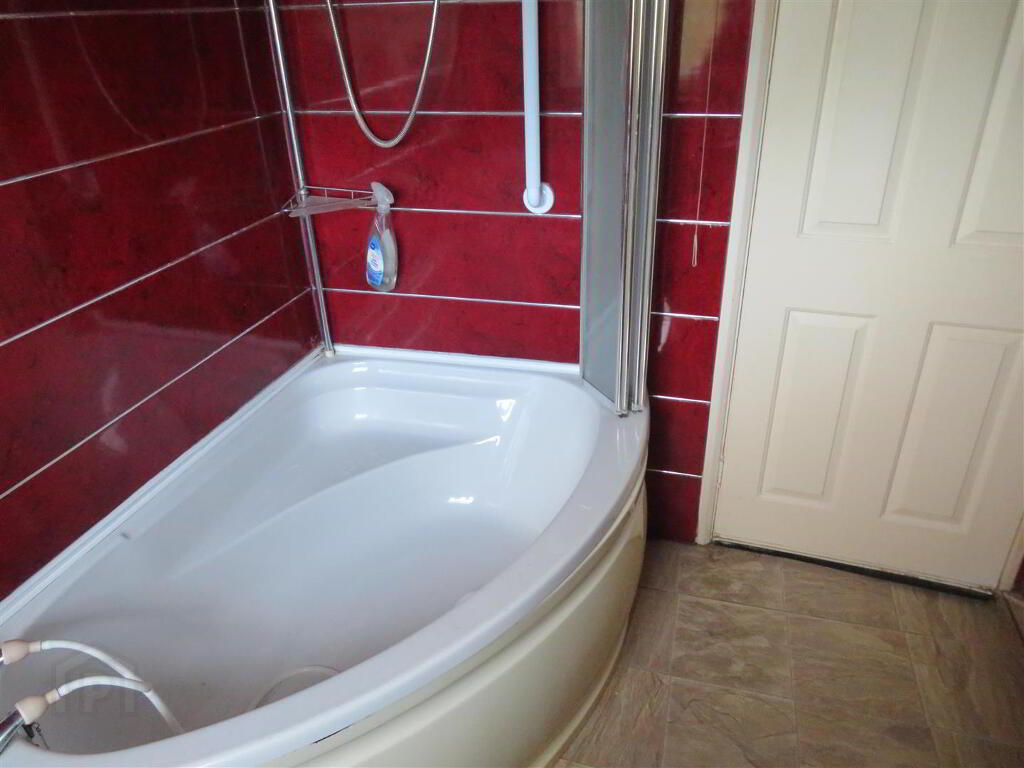 7’6 x 6’10 Corner panel bath with electric shower above, pedestal wash hand basin, WC and heated towel rail. Built in hot press, PVC panelled walls and PVC ceiling.