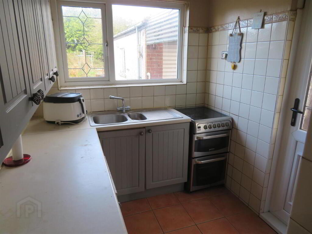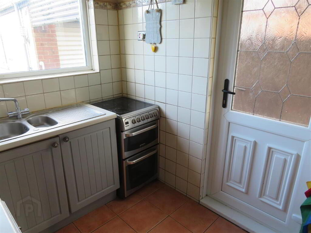High and low fitted units, space for free standing cooker, tiled floor, partially tiled walls and PVC glazed back door to rear.