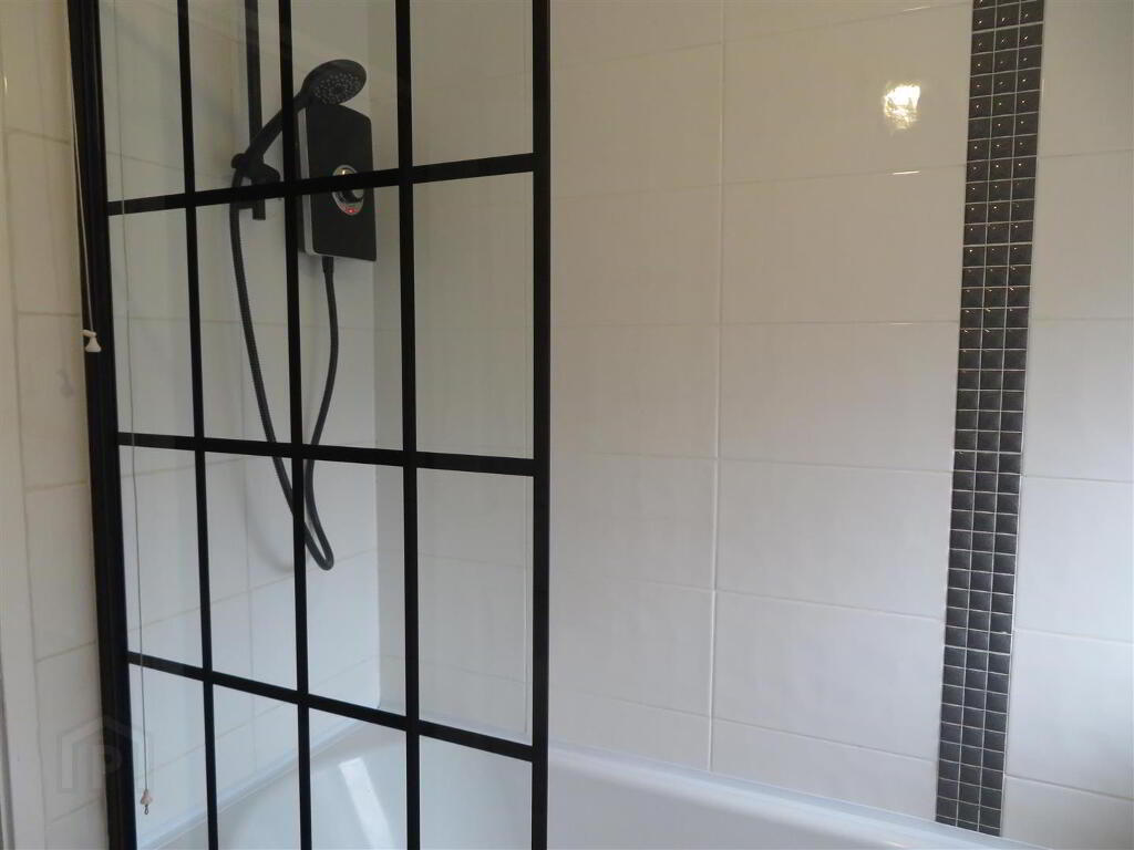 White panel bath with electric shower above, WC and pedestal wash hand basin. Fully tiled walls.