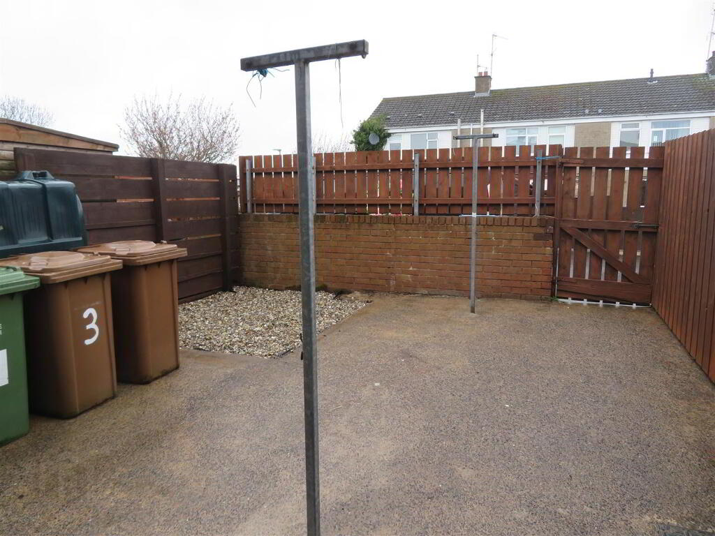 Enclosed, fully paved rear garden. Grass and mature shrubs to the front.